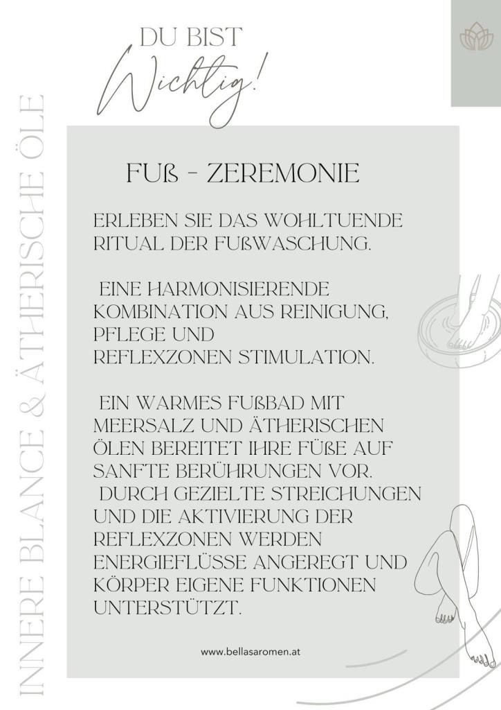 Erleben Sie eine alte Tradition der Fußwaschung , die Körper und Geist in Einklang bringt. Die Zeremonie beginnt mit einem entspannenden Fußbad aus Meersalz und ätherischen Ölen, das Ihre Füße sanft reinigt und pflegt. Anschließend werden Ihre Füße mit individuell abgestimmten Ölen balsamiert. Durch sanfte Streichungen und das Aktivieren von Energiepunkten entlang der Beine fördern wir die Durchblutung und das Wohlbefinden. Lassen Sie sich von diesem Ritual zu einem tiefen Gefühl der Leichtigkeit und Entspannung führen.